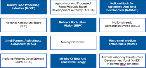 The Government of India through Ministry of Food Processing Industries (MoFPI), National Horticulture Board (NHB), NABARD, APEDA etc. have many launched many schemes over the past years to boost Agri and horticulture sector.
